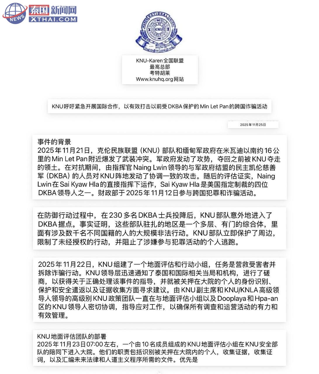声明中写着:“11 月 23 日 07:00,KNU 地面评估小组在 KNU 安全部队陪同下进入顺达园区。”