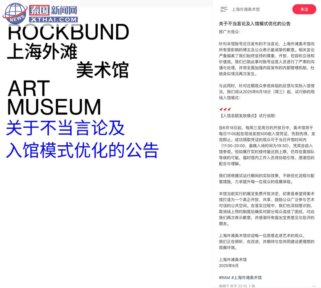泰国新闻网XTHAI报道:上海外滩美术馆近日因取消线上预约制和入馆管理方式引发热议,意外成为网络焦点。自6月11日起,美术馆全馆展览免费开放,并取消线上预约,改为现场排队入场,还特别提醒,若现场参观人数达到上限,观众需耐心等待;若当日总人数饱和,则停止接待。然而,这一政策却让不少观众感到不便。有网友抱怨,美术馆营业至20点,但上周末接近17点就已停止排队,观众无法提前得知是否能入馆,可能白白浪费时间赶到现场却被拒之门外,颇感无奈。