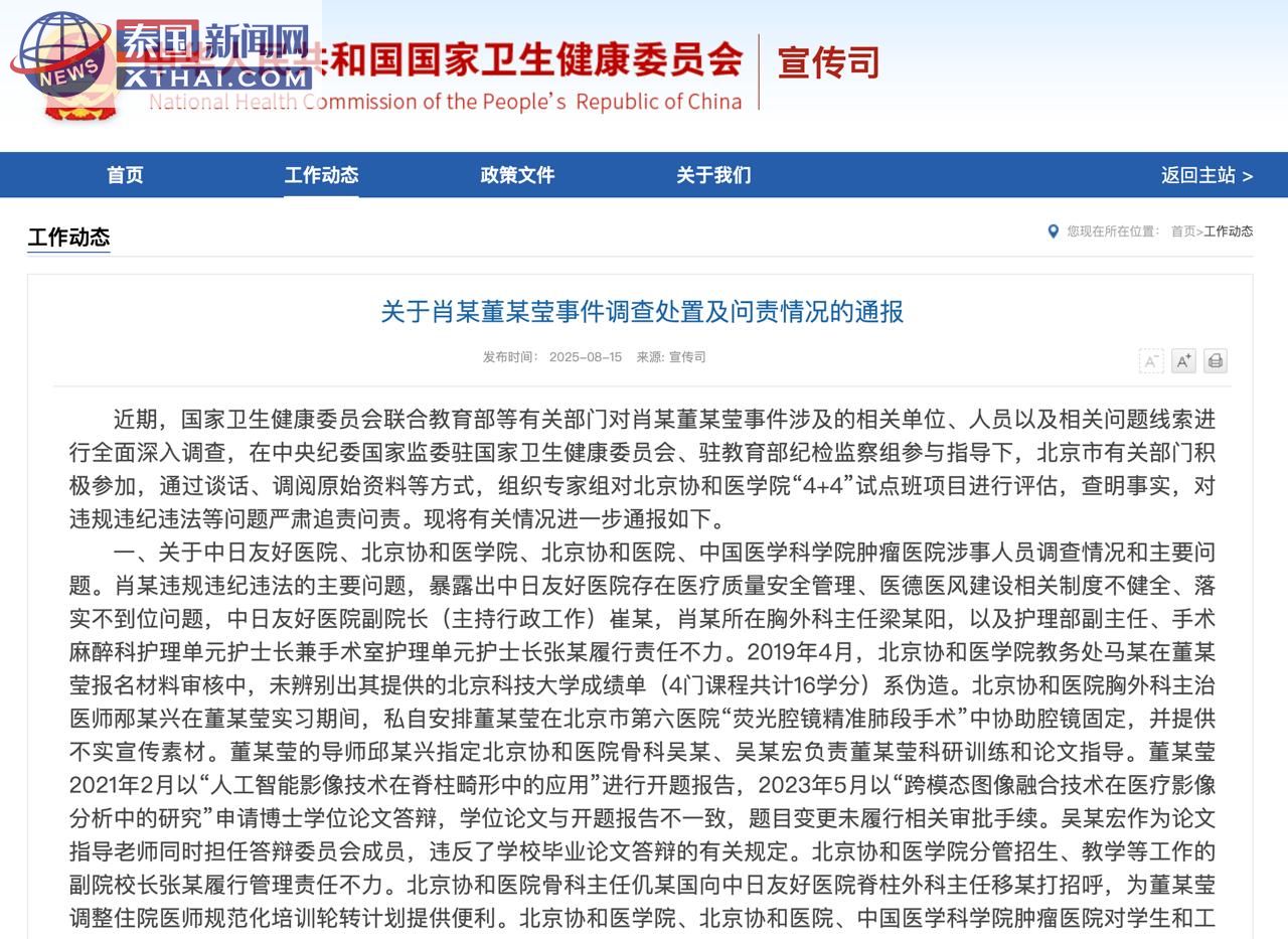 泰国新闻网XTHAI报道,近日,中国国家卫生健康委联合教育部等部门针对备受关注的肖某与董某莹事件发布了最新调查处置及问责通报。这起事件不仅牵涉个人道德与学术诚信问题,更直指医疗与教育领域的公平与质量痛点,引发社会广泛热议。