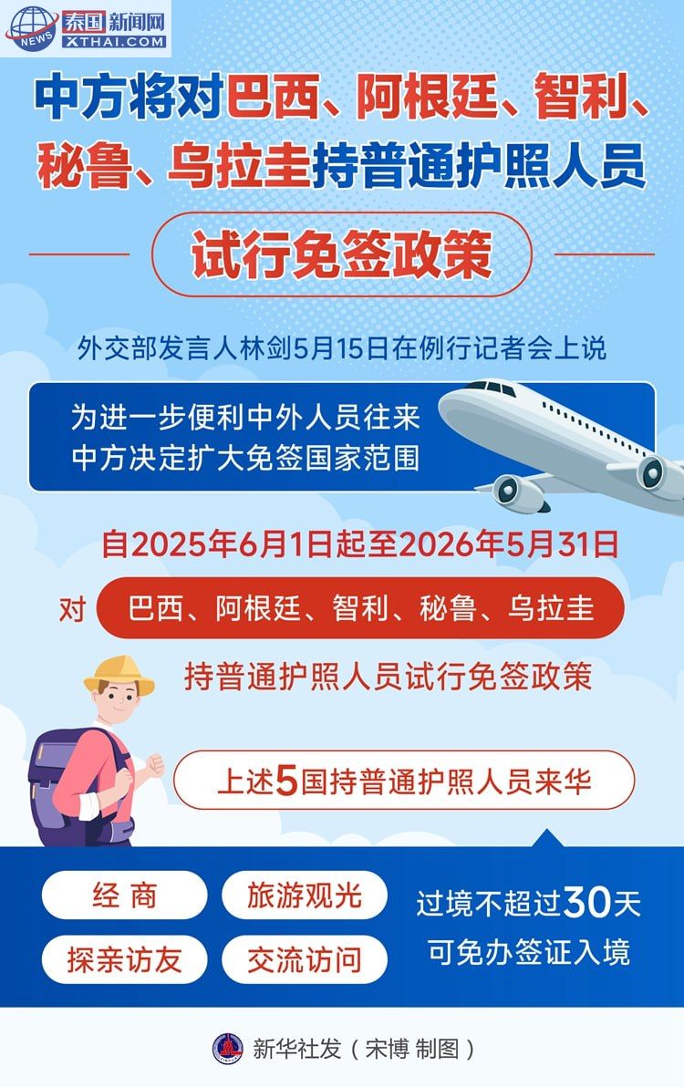 泰国新闻网XTHAI报道,中国外交部发言人林剑于5月15日在例行记者会上宣布,为进一步促进中外人员往来,中国决定自2025年6月1日起至2026年5月31日,对巴西、阿根廷、智利、秘鲁、乌拉圭五个国家持普通护照的人员试行免签政策。这意味着上述国家公民来华经商、旅游、探亲、交流或过境不超过30天,将无需办理签证即可入境。中国持续推动高水平对外开放,致力于提升国际人员往来便利性,展现出热情友好的国家形象。林剑还诚挚邀请更多外国友人前来中国,感受这个国家的多元魅力与蓬勃活力。