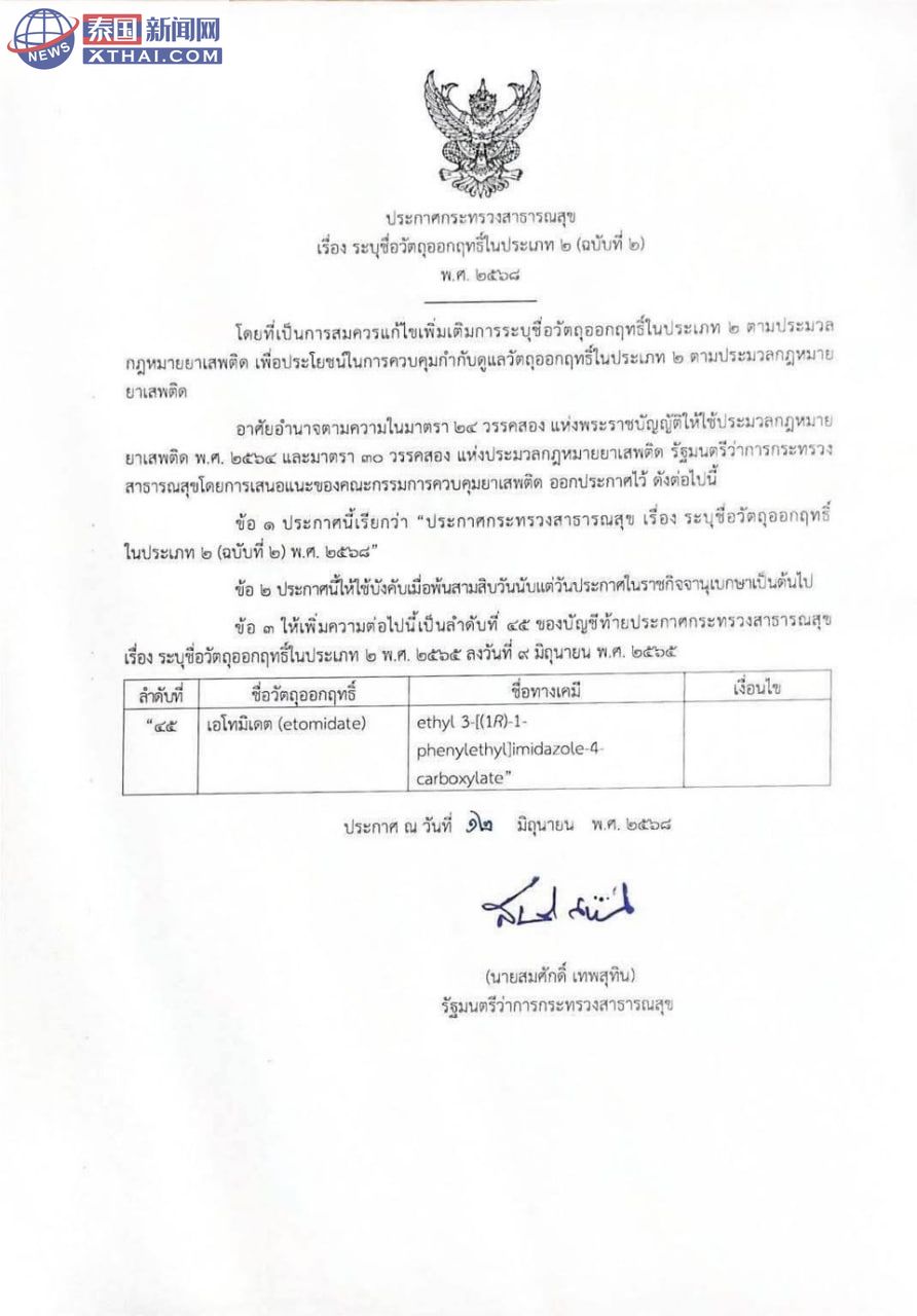 泰国新闻网XTHAI报道,近日,泰国公共卫生部长助理Thanakrit Jit-Areerat博士郑重宣布,依托咪酯(Etomidate)已被正式列为第二类精神药物。这一决定源于2025年6月12日卫生部长发布的公告,旨在加强对这种危险物质的管控,遏制其流入非法市场,特别是被混入电子烟作为“僵尸烟弹”使用的现象。