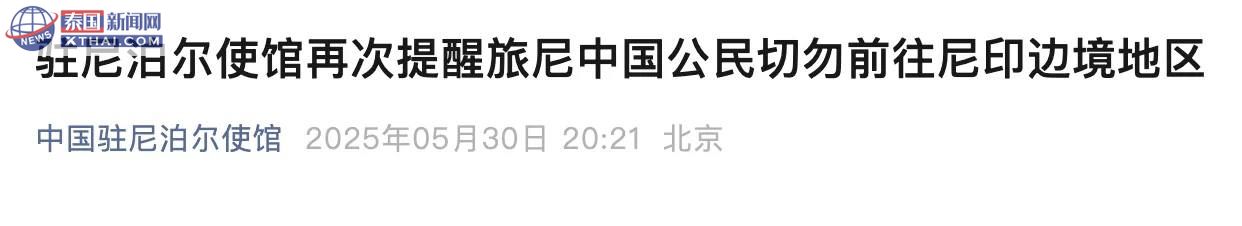 <img class="alignnone size-full" src="https://i.xthai.com/z7MzR0ihesDB0CRPS2_QXdKMevZMIA8-GVYAB4ee8YY/wm:0.7:nowe:::0.25/plain/s3://xthai/1748671372.jpg" /> <p class="ai-optimize-6 ai-optimize-introduction">泰国新闻网XTHAI报道,近日,中国驻尼泊尔使馆再次发出紧急提醒,强烈呼吁中国公民切勿前往尼印边境地区。据悉,尼泊尔和印度近期加强了边境巡逻和检查力度,尽管使馆多次警告,仍有部分中国公民无视劝告,执意前往,导致多起因涉嫌非法入境被印度边防部队拘捕的事件。尼印边境为开放边界,标识不清,中国公民极易误入印度境内,面临严厉处罚,甚至可能被判2至8年监禁且无法保释。使馆提醒公众务必提高警惕,避免因疏忽或侥幸心理酿成严重后果。</p> <p class="ai-optimize-7">#中国 #尼泊尔 #印度 #边境安全 #非法入境</p> <p class="ai-optimize-8"></p> <p class="ai-optimize-9"></p>