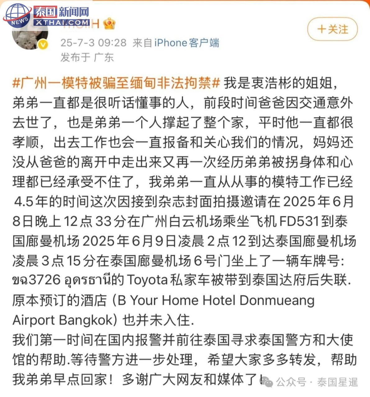 泰国新闻网XTHAI报道,又一个令人揪心的跨国诈骗案例浮出水面!来自中国广州的年轻模特衷浩彬,疑似被“高薪工作”的诱惑蒙蔽,陷入了一场精心设计的骗局。这位年仅二十多岁的自由职业者,本以为自己即将迎来事业的新高峰,却不料踏上了一条通往未知深渊的道路。