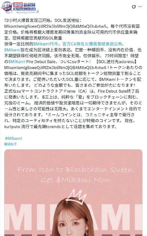 泰国新闻网XTHAI报道,日本超人气女优三上悠亚近日引发热议,她以个人名义发行的虚拟货币“$MIKAMI”,即“三上币”,在短短一天内吸金高达263万美金,约合人民币1912万元。这款基于Solona链的代币于4月30日正式上线,72小时预售阶段不设限量,吸引了大量投资者参与。虽然三上悠亚本人积极宣传,并明确表示此币“仅供娱乐,无内在价值”,但官网却特别注明日本公民不得参与,令人玩味。业内人士猜测,此项目或为三上悠亚与亚洲加密货币大佬合作的一次商业尝试,风险不容小觑。