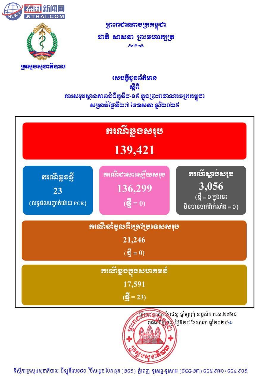 <p class="ai-optimize-8"><img class="alignnone size-full" src="https://i.xthai.com/IH-sAiCYKNCBMm24NKdYg0IXoBcAJSW-0yc_Mfp9vXE/wm:0.7:nowe:::0.25/plain/s3://xthai/1748520798.jpg" /></p> <p class="ai-optimize-6 ai-optimize-introduction">泰国新闻网XTHAI报道,柬埔寨卫生部最新发布疫情公告,全国范围内新增新冠肺炎病例23例,相较前几日仅7至8例的数字,病毒传播速度明显加快,令人担忧。此次疫情反弹引发了社会各界的高度关注,相关部门呼吁民众加强防护措施,遵守防疫规定,以遏制病毒进一步扩散。同时,公告中提到,当日并无康复病例或死亡病例的报告,显示疫情形势依然严峻,防控工作刻不容缓。</p> <p class="ai-optimize-7">#柬埔寨 #新冠肺炎 #疫情反弹 #公共卫生 </p>