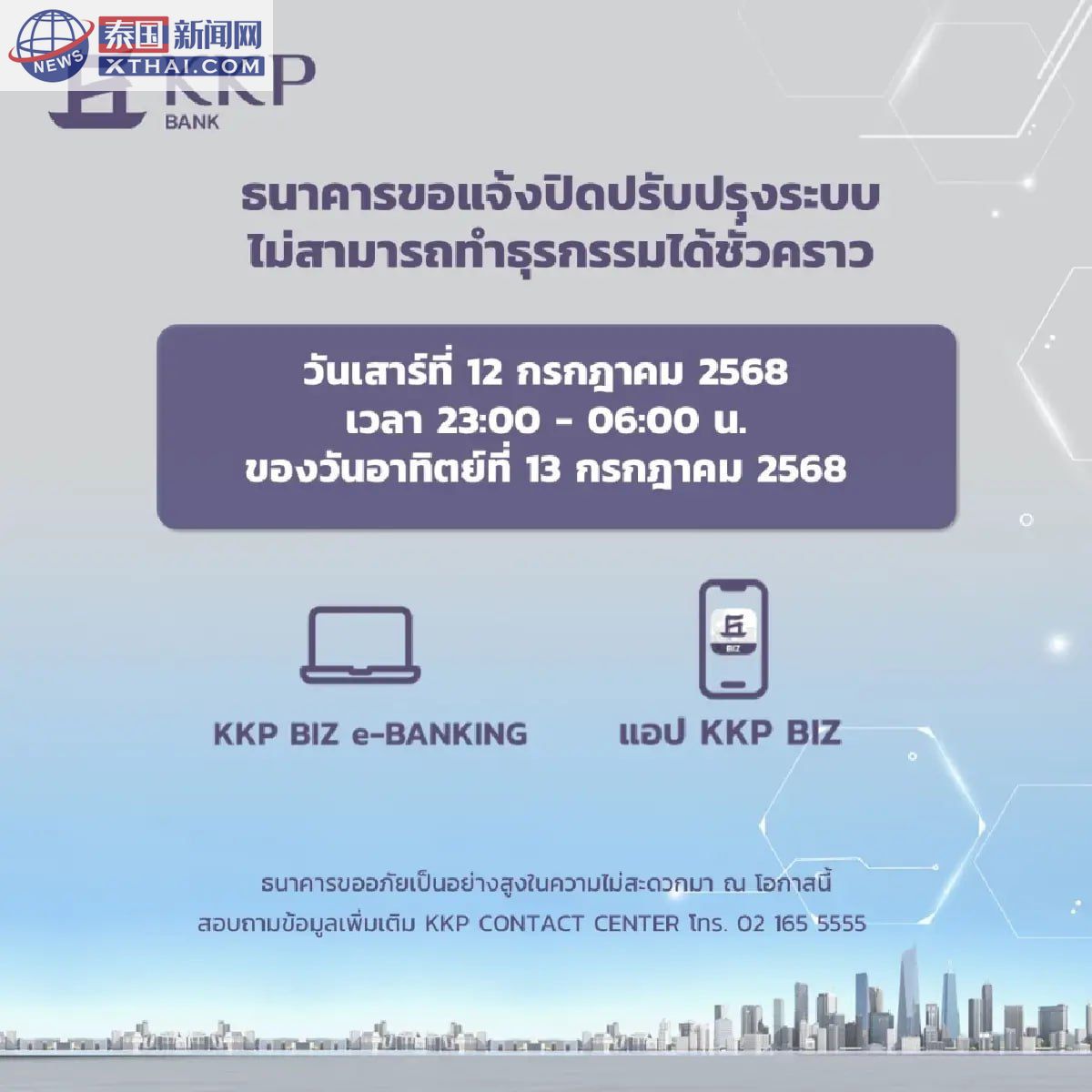 再看基亚特纳金银行(Kiatnakin),他们计划在2025年7月12日(星期六)晚上11点至7月13日早上6点关闭金融交易系统,特别是针对企业客户的KKP BIZ和KKP BIZ电子银行应用程序将全面暂停服务。企业用户们可得注意了,提前安排好交易计划,不然周末业务可能会被卡住。需要了解详情的,可以拨打KKP联系中心02 165 5555。