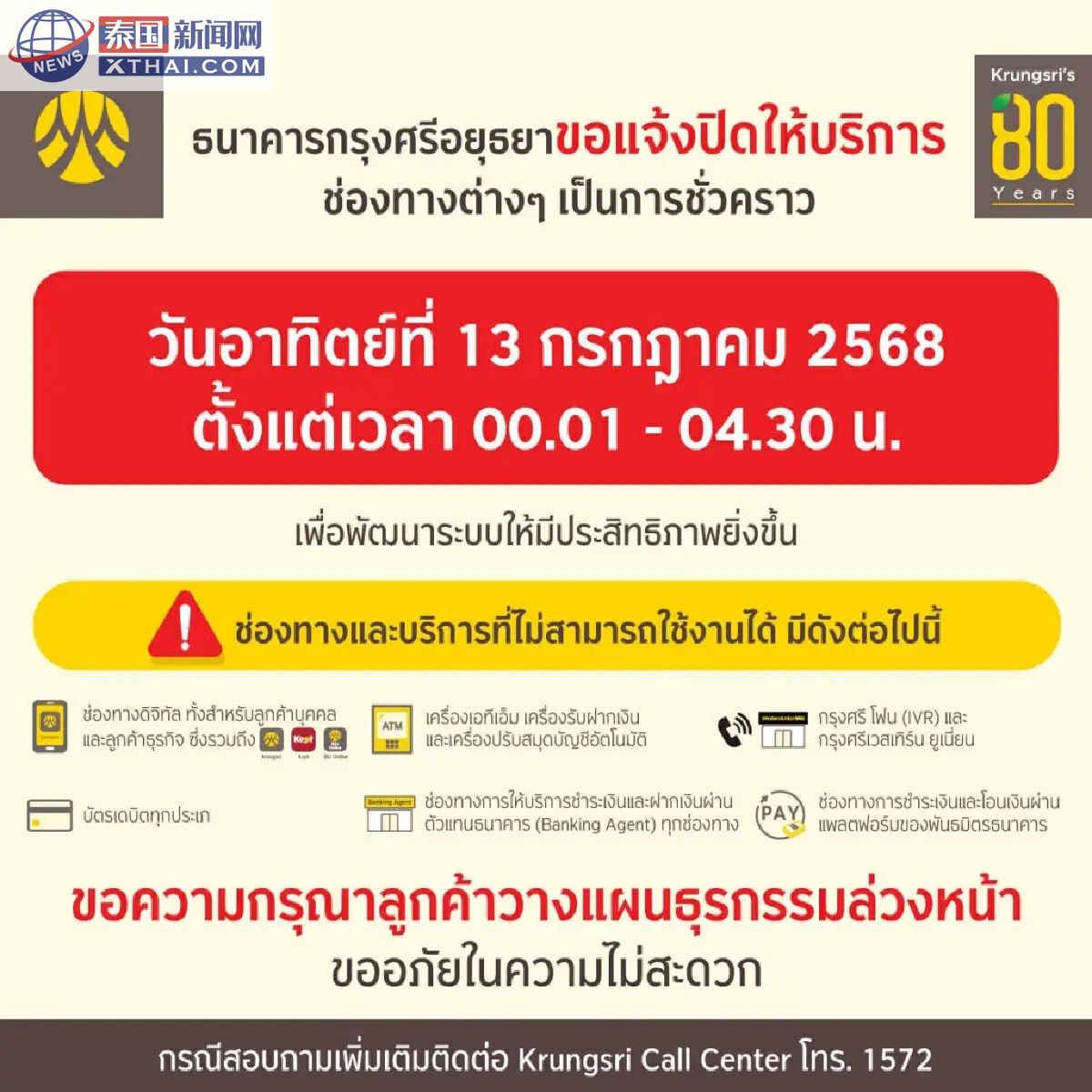 最后,大城银行(Krungsri Ayudhya)也不甘落后,宣布将在2025年7月13日(星期日)凌晨00:01至04:30关闭多个数字渠道进行维护。受影响的服务包括面向个人和企业客户的Krungsri App、Kept、KBOL等应用,以及所有借记卡、ATM机、存款机、存折更新机,甚至通过银行代理的支付存款服务和Krungsri电话服务都会暂停。这波操作可以说是“全面停摆”,影响范围相当广。银行建议客户提前做好交易规划,如果有问题可拨打客服中心1572求助。顺带一提,Krungsri还提醒用户,平时使用ATM或银行卡时要注意安全,定期更换PIN码,别随手把密码和卡放在一起,以免不必要的麻烦。