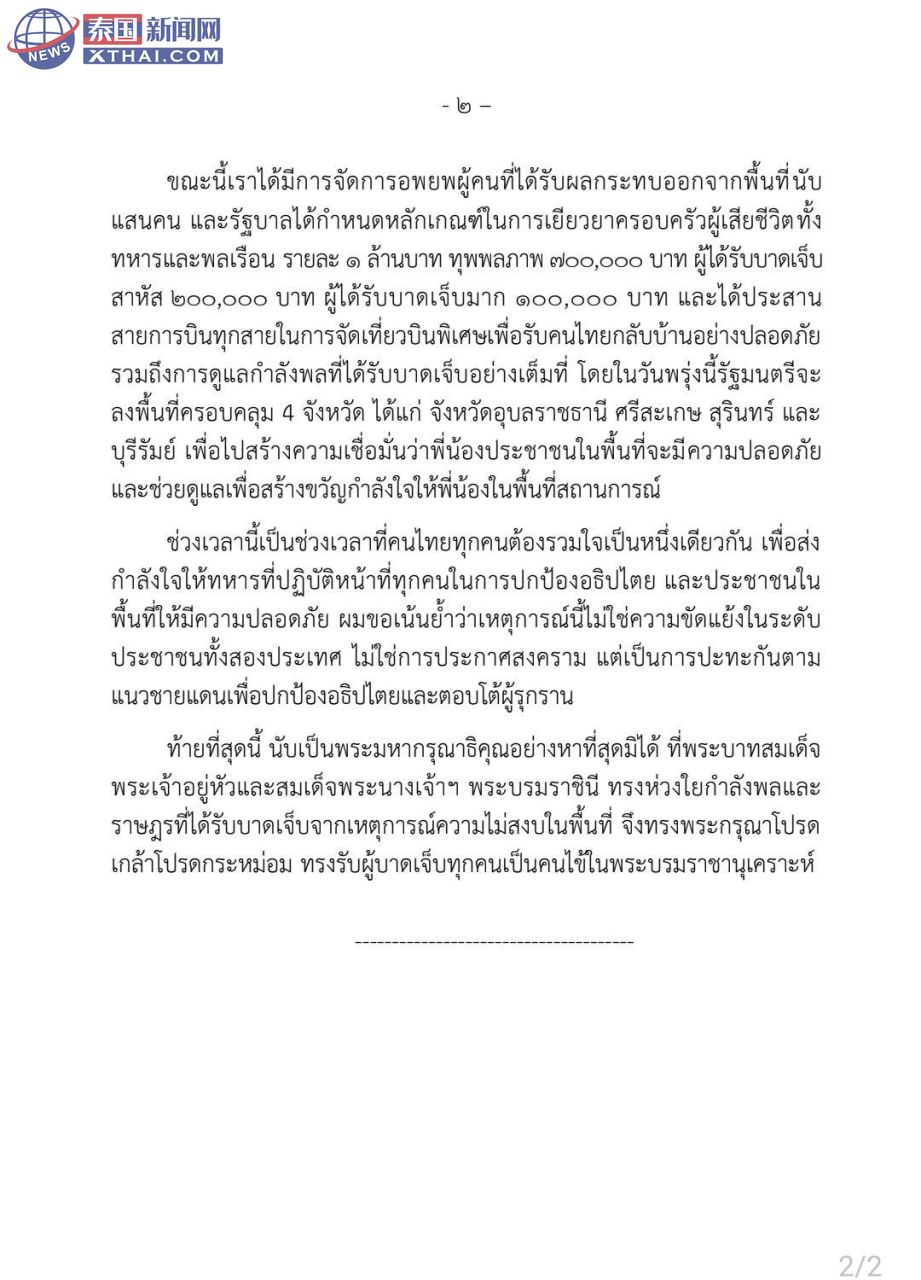 声明最后,泰国政府对国王陛下和王后陛下表达了由衷敬意,感谢他们对受伤军民的深切关怀,并特赐医疗资源,将伤者纳入王室医疗照护体系。这一恩典让无数泰国人民备受感动,也为前线和后方的同胞注入了更多信心。