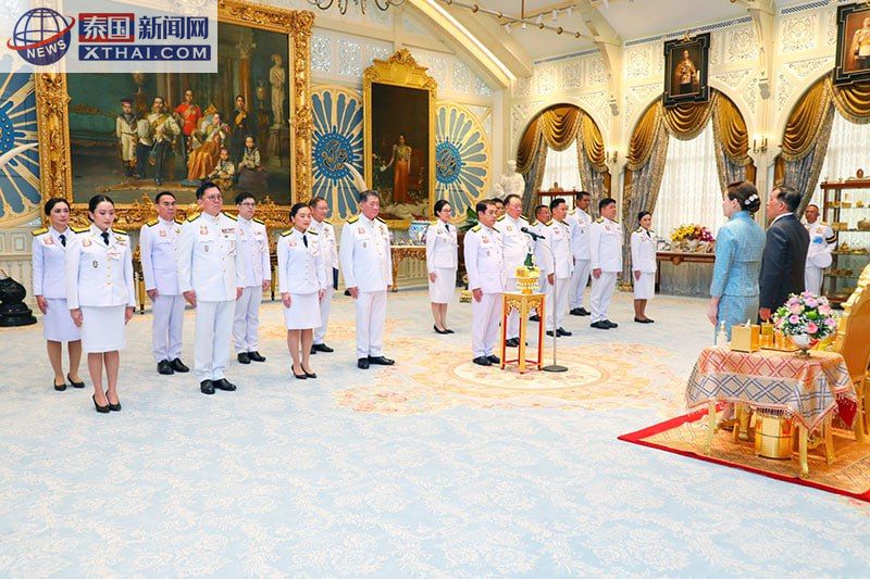 泰国新闻网XTHAI报道,7月3日11时11分,泰国国王陛下与王后殿下在曼谷杜西特宫殿御座,接见由副总理兼代总理素利亚率领的新一届内阁成员,并主持就职宣誓仪式,正式授予各部长履职权力。