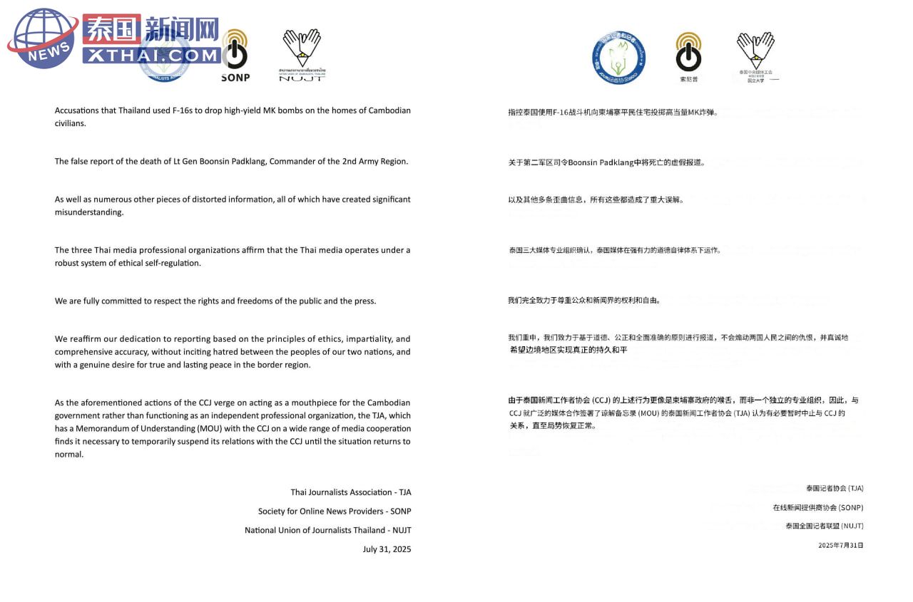 不仅如此,泰国三大媒体协会近日也站出来发声,针对柬埔寨记者俱乐部(CCJ)散布的虚假言论表达强烈不满。他们公开呼吁CCJ停止对泰国媒体的无端指责,并举例揭露柬埔寨媒体如何编造不实新闻,例如宣称泰国军队在边境冲突中使用化学武器等完全未经证实的内容。泰国媒体协会还警告,CCJ正逐渐沦为柬埔寨政府的宣传工具,丧失新闻媒体应有的独立性和客观性。