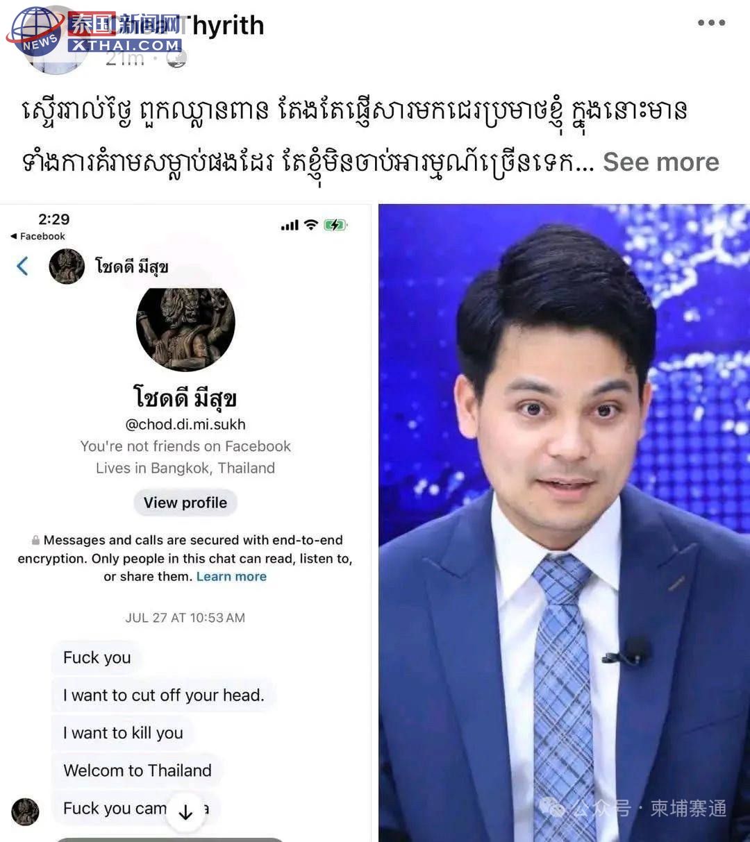 泰国新闻网XTHAI报道,柬埔寨参议院主席、人民党主席洪森的发言人谢天龙近日站出来“硬刚”威胁者,公开披露自己几乎每天都收到来自极端分子的辱骂和死亡威胁信息。8月20日,他在社交媒体上爆料,有极端分子通过Facebook放狠话,扬言如果他敢踏足泰国,就要“砍下他的头”!