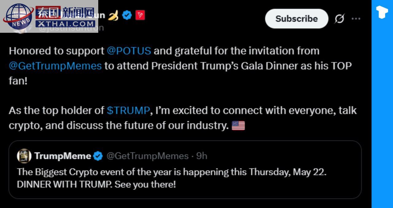 <img class="alignnone size-full" src="https://i.xthai.com/wrICkipIA04WfbNLhOQ8vrr6haVFC393EqobtPsIqTk/wm:0.7:nowe:::0.25/plain/s3://xthai/1747743217.jpg" /> 泰国新闻网XTHAI报道,现任美国总统唐纳德·特朗普将于5月22日在华盛顿附近的高尔夫俱乐部举办一场备受瞩目的私人晚宴,邀请TRUMP memecoin的前220名持有者参与。据悉,波场TRON创始人孙宇晨作为该代币的最大持有者,将有机会与特朗普总统面对面交流。这场晚宴不仅引发了加密货币社区的广泛关注,也被外界视为政治与数字资产领域交融的新象征。业内人士猜测,这或将进一步推动美国对加密货币的友好政策。 #美国 #加密货币 #特朗普晚宴 #孙宇晨