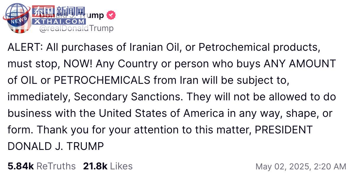 泰国新闻网XTHAI报道,现任美国总统特朗普在其第二次当选后,继续加强对伊朗的“极限施压”政策。5月1日,他在社交媒体上发布重磅声明,警告全球:“所有购买伊朗石油或石化产品的行为必须立即停止!任何国家或个人若违反此令,将立即面临二级制裁,彻底断绝与美国的任何生意往来。”此举意在将伊朗石油出口降至零,并遏制其核武器发展。据悉,特朗普政府已对包括中国一家原油储存终端在内的多个目标实施制裁,力度空前。此次政策不仅剑指伊朗,还对全球能源市场格局构成深远影响,引发国际社会高度关注。