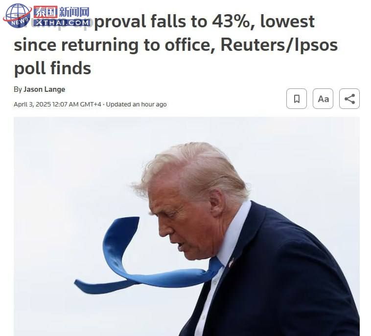 <img class="alignnone size-full" src="https://i.xthai.com/EFWnfZbb242zXOeULFpOrA2KllITGcM46Ep-thklwI8/wm:0.7:nowe:::0.25/plain/s3://xthai/1743740763.jpg" /> 泰国新闻网XTHAI.COM报道|最新民调!路透社独数据显示,美国总统特朗普民意支持率骤降至43%,创下他重返总统职位以来的最低水平 。#特朗普支持率暴跌 #路透社民调,#政治格局变动,#司法争议影响选情