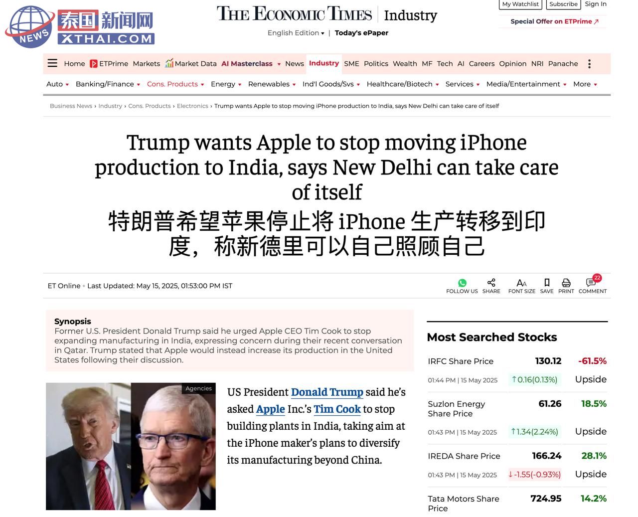 泰国新闻网XTHAI报道,现任美国总统特朗普在其第二次当选后,继续对美国企业的海外生产计划施加压力。他在卡塔尔进行国事访问期间透露,已明确要求苹果公司首席执行官蒂姆·库克停止在印度的建厂计划,称不希望苹果在印度扩大生产。特朗普直言,印度是全球关税壁垒最高的国家之一,销售美国商品困难重重,但也提到印度方面已提出降低关税的意向,希望就此达成协议。他强调,经过讨论,苹果将进一步扩大在美国的生产规模。这一表态无疑给苹果的印度转产计划蒙上阴影,此前苹果计划到明年底前从印度进口大部分在美国市场销售的iPhone。