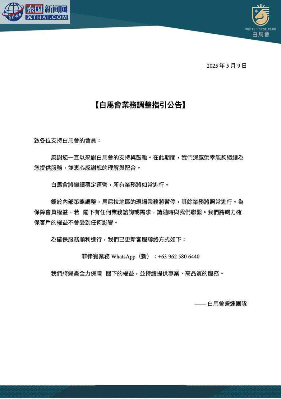 泰国新闻网XTHAI报道,近日,菲律宾知名组织白马会发布重要公告,宣布因内部策略调整,将暂停马尼拉地区的现场业务,其他所有业务则将继续正常运营。白马会方面表示,他们对会员一如既往的支持深表感激,并承诺将全力保障会员权益不受影响。为此,他们更新了客服联络方式,菲律宾业务的新WhatsApp号码为+63 962 580 6440。白马会营运团队强调,他们将持续提供专业高品质的服务,确保每位会员的需求得到妥善处理。值得关注的是,白马会还通过公告呼吁东南亚地区的娱乐爱好者体验其平台,展现出对未来发展的信心。