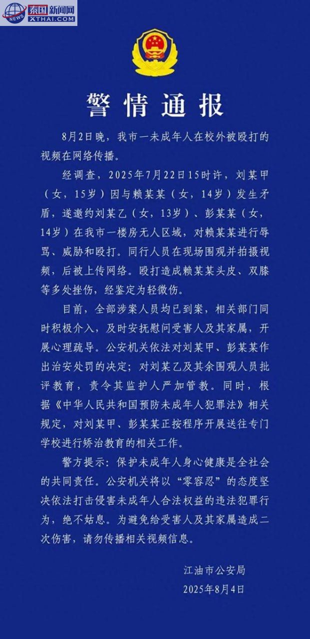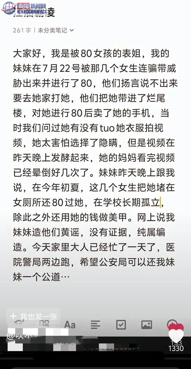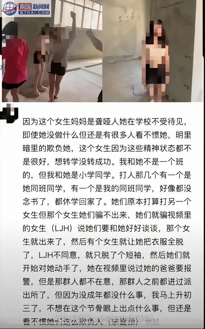 泰国新闻网XTHAI报道,近日,中国四川绵阳发生了一起令人痛心的校园霸凌事件,引发社会广泛关注和愤怒。一名15岁的女孩被同龄人骗至一处废弃场地,遭到一群少年的残忍殴打,过程分工明确,有人守门、有人拍摄视频、有人直接动手,手段之恶劣令人发指。受害女孩的表姐站出来披露,妹妹长期在学校遭受欺凌,手机被卖,隐私视频被拍摄,甚至学校内还充斥着针对她的恶意谣言。由于家庭条件一般,母亲又是聋哑人,女孩性格内向敏感,长期被排挤和辱骂,而面对这一切,她只能选择隐忍。