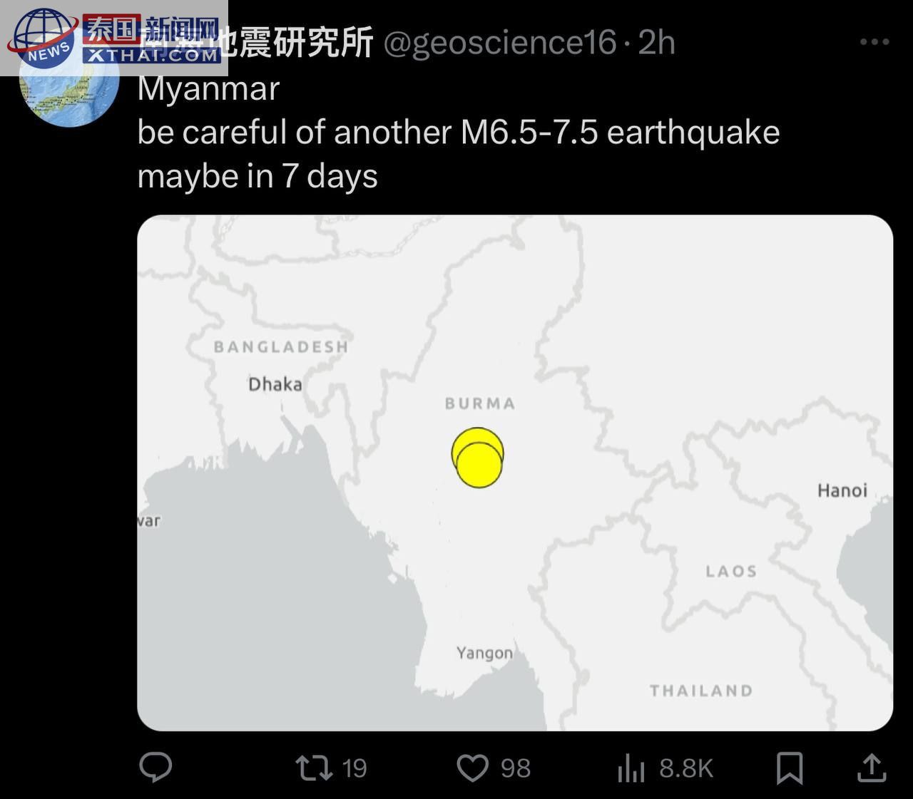 泰国新闻网XTHAI.COM报道:近日,一则关于缅甸未来7天内可能发生6.5-7.5级地震的预测在社交平台上疯传,经泰国新闻网核查,发布该消息的“日本南海地震研究所”并非官方认证机构,而是利用AI模型进行推演。