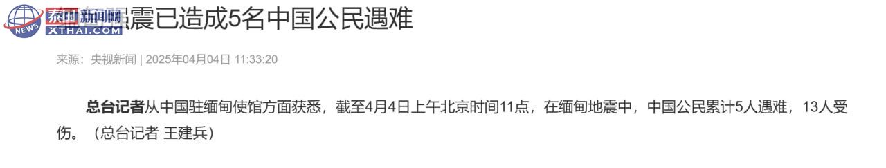 【突发:缅甸强震致中国公民5死13伤 国际救援力量持续挺进】据中国驻缅甸大使馆最新通报,截至4月4日11时,缅甸突发强震已导致中国公民5人罹难、13人受伤。目前缅甸消防部门联合国际救援队成功营救653名幸存者,中方使领馆正开展紧急医疗支援与人员安置,并与缅甸当局建立24小时应急对接机制。值得警惕的是,震区余震频发风险犹存,中国驻缅使馆紧急呼吁在缅公民:立即完善住所安全防护,同步关注使馆官方通报,遇险情第一时间拨打领保热线。国际地震专家指出,本次震源深度较浅或加剧次生灾害,驻缅中企已启动应急预案加强安保层级。
