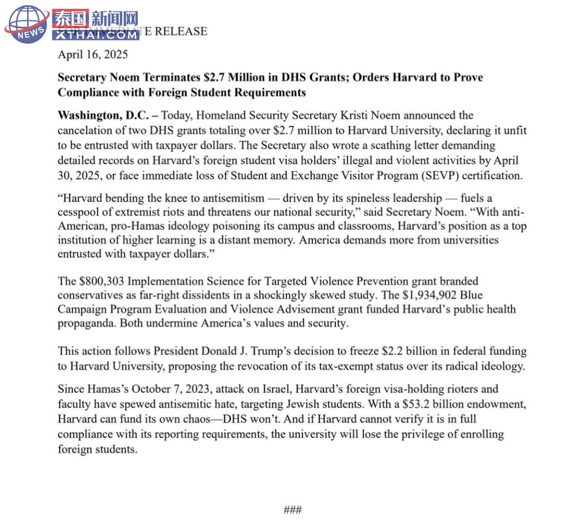 泰国新闻网XTHAI.COM报道,美国国税局近日宣布将取消哈佛大学的免税资格,这一决定预计将使这所世界顶尖学府损失数十亿美元的资金支持。这一重磅消息无疑对哈佛大学造成了巨大的经济压力。与此同时,美国国土安全部长克里斯蒂·诺姆向哈佛大学发出最后通牒,要求其在4月30日前提交外国学生中激进分子的相关记录,否则将禁止该校继续接收国际学生。据悉,国际学生占哈佛学生总数的20%以上,这一政策可能对学校招生和多元文化环境造成深远影响。此外,有分析指出,这一连串举措或与现任总统特朗普第二次当选后的政策调整有关,其对教育领域的强硬态度引发广泛关注。