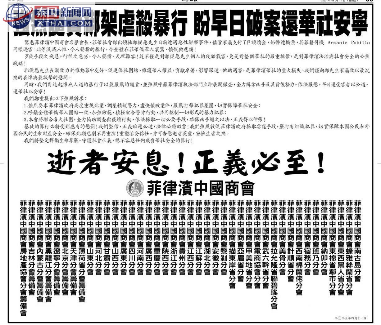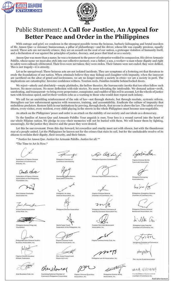 泰国新闻网XTHAI.COM报道|菲律宾华社震怒!商界集体请愿敦促政府根治绑架毒瘤