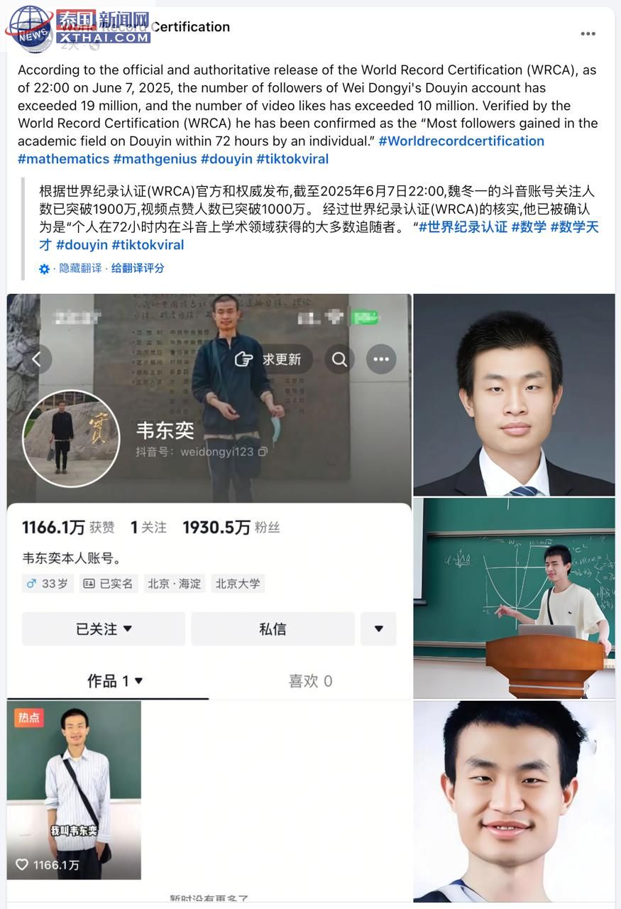 泰国新闻网XTHAI报道,北京大学数学科学学院研究员韦东奕近日因开通个人抖音账号而成为全球焦点,其粉丝增长速度之快令人瞠目结舌。截至6月11日,他的账号粉丝数已突破2400万,并被世界纪录认证机构(WRCA)确认为“72小时内抖音平台学术领域获得粉丝最多的人”。韦东奕的账号于高考倒计时期间上线,一条仅4秒的自我介绍视频便引发热潮,三天内粉丝从0飙升至1900多万,平均每分钟新增440个粉丝,展现了学术明星的巨大号召力。这不仅是个人的成就,更彰显了知识与才华在新时代的无限魅力,激励着更多人追求卓越。