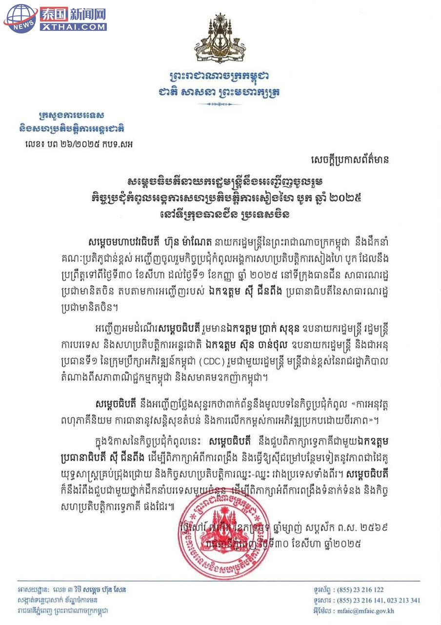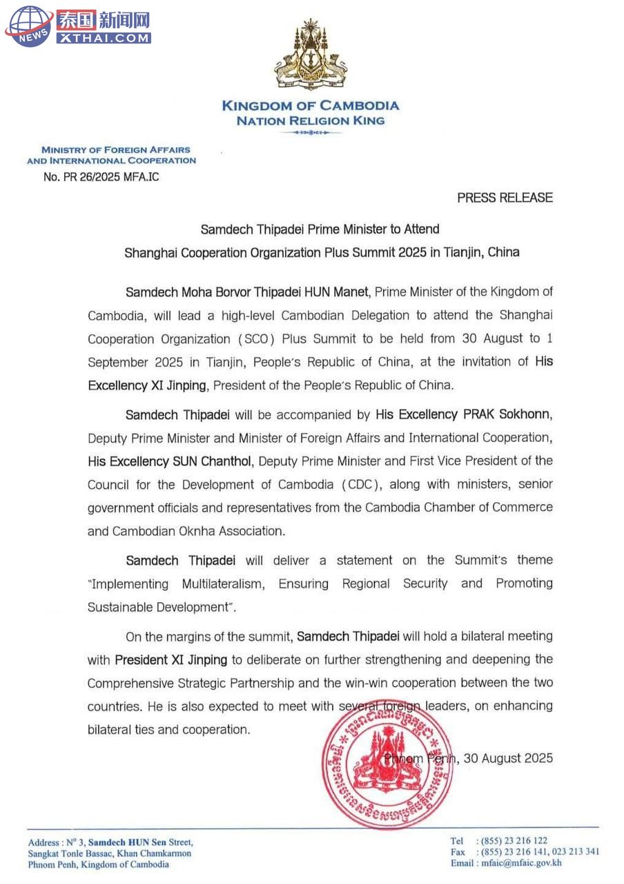泰国新闻网XTHAI报道,柬埔寨总理洪玛奈将在2025年上海合作组织峰会期间,与中国国家主席习近平会面,双方将就如何进一步加强和深化中柬全面战略伙伴关系展开讨论。这次会晤被视为两国“铁杆兄弟”情谊的又一次延续,双方预计将在互利合作领域擦出更多火花。