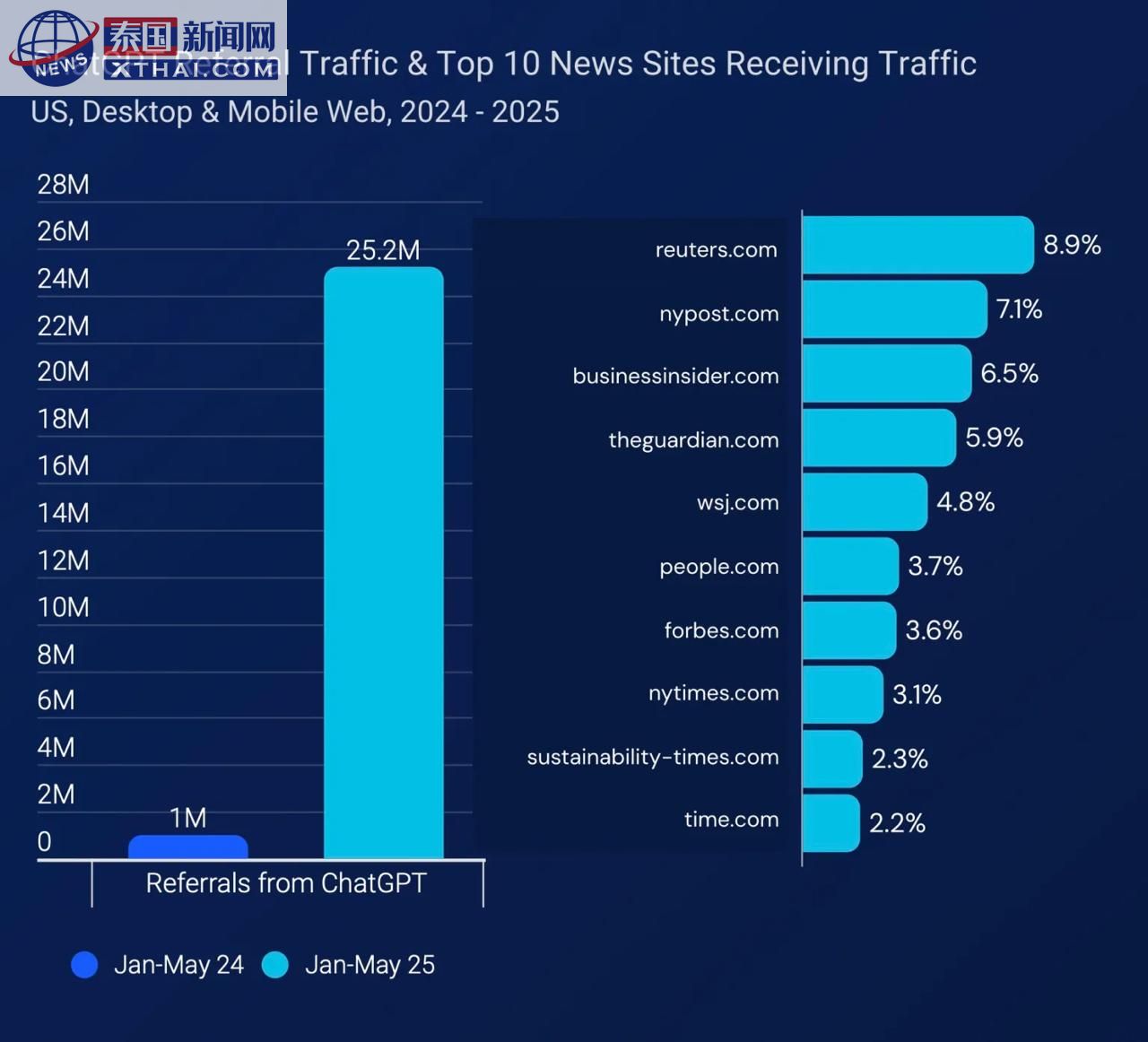 泰国新闻网XTHAI报道,近年来,AI技术的迅猛发展让新闻行业既迎来了新机遇,也面临着前所未有的挑战。数据显示,ChatGPT为新闻网站带来的流量增长令人瞩目,从2024年初到2025年5月,引流次数暴增25倍,达到2500万次。然而,这点“流量甘露”却难以浇灭新闻网站因AI搜索普及而导致的搜索流量下滑之火。自谷歌在2024年5月推出AI Overviews功能以来,新闻类搜索中无跳转的比例从56%飙升至近69%,直接导致新闻网站有机访问量从巅峰时期的23亿次跌至17亿次,流量“断崖式”下跌让不少媒体叫苦不迭。