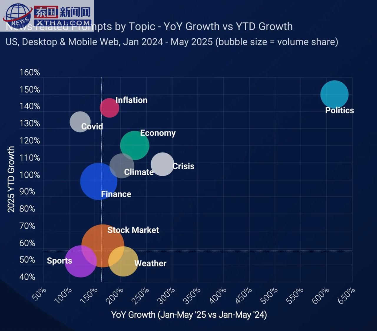 在这种情况下,ChatGPT的流量贡献虽有亮点,但分布却颇为不均。像路透社、纽约邮报和Business Insider等媒体,流量增幅名列前茅,可谓“吃到了AI的甜头”;而像纽约时报这样的传统大牌,流量增长却仅为3.1%,几乎“无感”。更有趣的是,用户通过ChatGPT询问新闻相关内容的数量激增了212%,尤其是财经、体育领域最受关注,政治和经济话题也逐渐升温,反映出用户对即时信息的高需求。