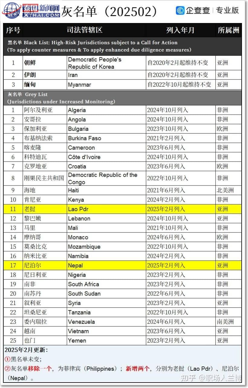 泰国新闻网XTHAI报道,2025年2月,金融行动特别工作组(FATF)更新了反洗钱和反恐怖融资的全球名单,引发国际社会广泛关注。在最新公布的黑名单中,朝鲜、伊朗和缅甸三国仍被列为高风险国家,而灰名单则包括25个国家和地区,其中老挝和尼泊尔为新增国家。值得一提的是,菲律宾因在金融监管和透明度方面的显著进步,成功退出灰名单。这一变化对全球金融体系具有深远影响,被列入名单的国家需进一步加强措施以重获信任。此外,这一动态也提醒各国重视金融安全,防范潜在风险。